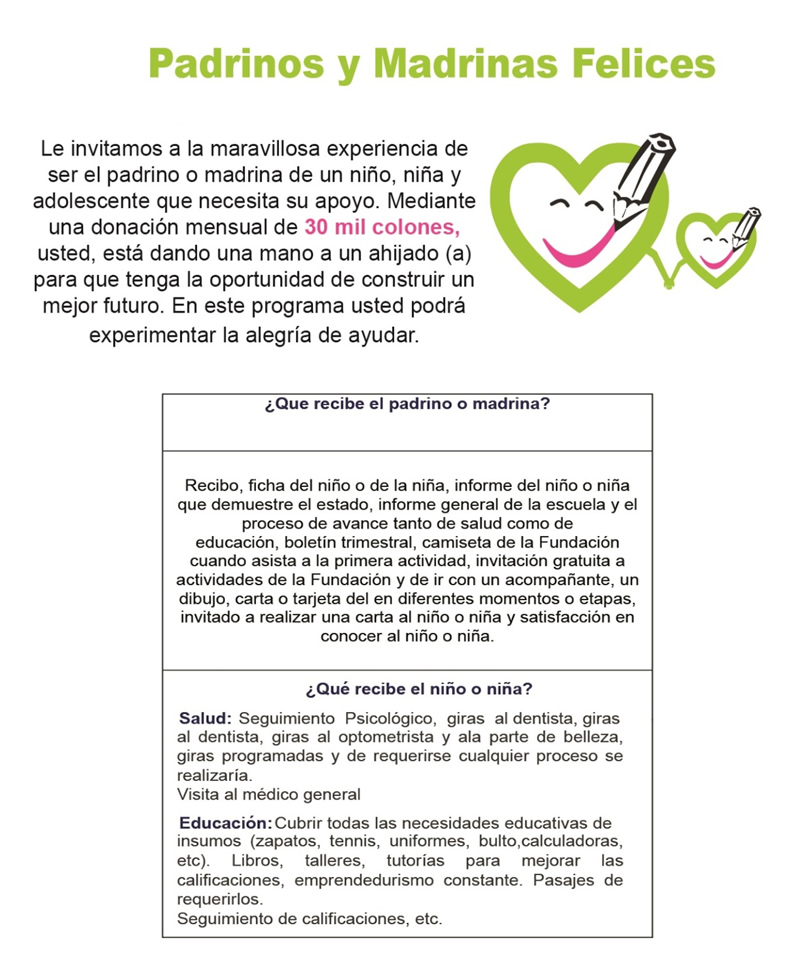 Un padrino o madrina feliz es una persona que quiere comprometerse con el seguimiento de un niño, niña o adolescente para garantizar su permanencia en las aulas. Mediante una donación mensual le brinda la oportunidad de un mejor futuro, permitiendo a la fundación darle seguimiento, tanto en salud como en educación, de acorde a la prioridad de sus necesidades.